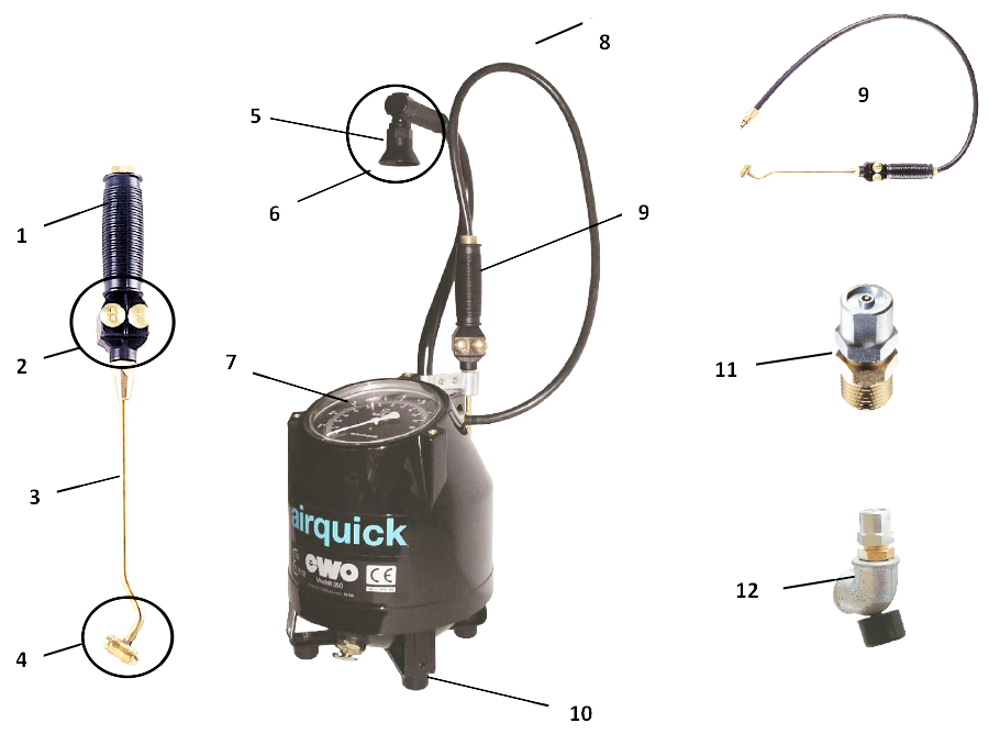 • Sammanställning av de vanligaste reservdelarna till den bärbara luftpåfyllaren Airquick 350